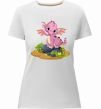Жіноча преміум-футболка власного виробництва приталеного крою. Виготовлена з якісної тканини (95% бавовна, 5% еластан) — щільна, м'яка та приємна до тіла. Принт Рожевий динозавр можна розмістити на грудях, спині або рукаві.