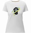 Жіноча преміум-футболка власного виробництва приталеного крою. Виготовлена з якісної тканини (95% бавовна, 5% еластан) — щільна, м'яка та приємна до тіла. Принт Рука зі стрічкою прапор ВИШИВКА можна розмістити на грудях, спині або рукаві.