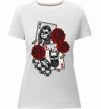 Жіноча преміум-футболка власного виробництва приталеного крою. Виготовлена з якісної тканини (95% бавовна, 5% еластан) — щільна, м'яка та приємна до тіла. Принт Santa Muerte and skull можна розмістити на грудях, спині або рукаві.