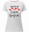 Жіноча преміум-футболка власного виробництва приталеного крою. Виготовлена з якісної тканини (95% бавовна, 5% еластан) — щільна, м'яка та приємна до тіла. Принт Щастя це дебет = кредит можна розмістити на грудях, спині або рукаві.
