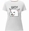 Жіноча преміум-футболка власного виробництва приталеного крою. Виготовлена з якісної тканини (95% бавовна, 5% еластан) — щільна, м'яка та приємна до тіла. Принт Шо ? можна розмістити на грудях, спині або рукаві.