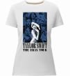 Жіноча преміум-футболка власного виробництва приталеного крою. Виготовлена з якісної тканини (95% бавовна, 5% еластан) — щільна, м'яка та приємна до тіла. Принт The eras tour blue можна розмістити на грудях, спині або рукаві.