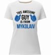 Жіноча преміум-футболка власного виробництва приталеного крою. Виготовлена з якісної тканини (95% бавовна, 5% еластан) — щільна, м'яка та приємна до тіла. Принт This awesome guy is from Mykolaiv можна розмістити на грудях, спині або рукаві.