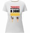 Жіноча преміум-футболка власного виробництва приталеного крою. Виготовлена з якісної тканини (95% бавовна, 5% еластан) — щільна, м'яка та приємна до тіла. Принт Тихо! можна розмістити на грудях, спині або рукаві.