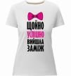 Жіноча преміум-футболка власного виробництва приталеного крою. Виготовлена з якісної тканини (95% бавовна, 5% еластан) — щільна, м'яка та приємна до тіла. Принт Щойно успішно вийшла заміж можна розмістити на грудях, спині або рукаві.