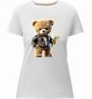 Жіноча преміум-футболка власного виробництва приталеного крою. Виготовлена з якісної тканини (95% бавовна, 5% еластан) — щільна, м'яка та приємна до тіла. Принт Ведмедик з букетом квітів можна розмістити на грудях, спині або рукаві.