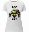 Жіноча преміум-футболка власного виробництва приталеного крою. Виготовлена з якісної тканини (95% бавовна, 5% еластан) — щільна, м'яка та приємна до тіла. Принт Warcraft Orc Life можна розмістити на грудях, спині або рукаві.