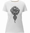 Жіноча преміум-футболка власного виробництва приталеного крою. Виготовлена з якісної тканини (95% бавовна, 5% еластан) — щільна, м'яка та приємна до тіла. Принт Змія візерунки можна розмістити на грудях, спині або рукаві.