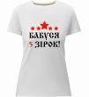 Женская приталенная премиум-футболка собственного производства. Выполнена из качественной ткани (95% хлопок, 5% эластан) — плотная, мягкая и приятная к телу. Принт Бабуся 5 зірок можно нанести на грудь, спину или рукав.