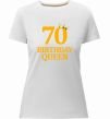 Женская приталенная премиум-футболка собственного производства. Выполнена из качественной ткани (95% хлопок, 5% эластан) — плотная, мягкая и приятная к телу. Принт 70 birthday queen можно нанести на грудь, спину или рукав.