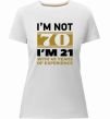 Женская приталенная премиум-футболка собственного производства. Выполнена из качественной ткани (95% хлопок, 5% эластан) — плотная, мягкая и приятная к телу. Принт I'm not 70 i'm 21 with 49 years of experience можно нанести на грудь, спину или рукав.