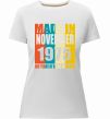 Женская приталенная премиум-футболка собственного производства. Выполнена из качественной ткани (95% хлопок, 5% эластан) — плотная, мягкая и приятная к телу. Принт Made in November 1975 50 years of being awesome можно нанести на грудь, спину или рукав.