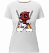 Женская приталенная премиум-футболка собственного производства. Выполнена из качественной ткани (95% хлопок, 5% эластан) — плотная, мягкая и приятная к телу. Принт Дедпул на веселці можно нанести на грудь, спину или рукав.