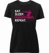 Женская приталенная премиум-футболка собственного производства. Выполнена из качественной ткани (95% хлопок, 5% эластан) — плотная, мягкая и приятная к телу. Принт Eat sleep handstand repeat можно нанести на грудь, спину или рукав.