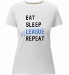 Женская приталенная премиум-футболка собственного производства. Выполнена из качественной ткани (95% хлопок, 5% эластан) — плотная, мягкая и приятная к телу. Принт eat sleep league repeat можно нанести на грудь, спину или рукав.