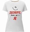 Женская приталенная премиум-футболка собственного производства. Выполнена из качественной ткани (95% хлопок, 5% эластан) — плотная, мягкая и приятная к телу. Принт Добре там де є я можно нанести на грудь, спину или рукав.