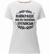 Женская приталенная премиум-футболка собственного производства. Выполнена из качественной ткани (95% хлопок, 5% эластан) — плотная, мягкая и приятная к телу. Принт Луганськ найкраще місто України можно нанести на грудь, спину или рукав.