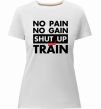 Женская приталенная премиум-футболка собственного производства. Выполнена из качественной ткани (95% хлопок, 5% эластан) — плотная, мягкая и приятная к телу. Принт No pain no gain shut up and train можно нанести на грудь, спину или рукав.
