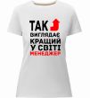 Женская приталенная премиум-футболка собственного производства. Выполнена из качественной ткани (95% хлопок, 5% эластан) — плотная, мягкая и приятная к телу. Принт Так виглядає кращий у світі менеджер можно нанести на грудь, спину или рукав.
