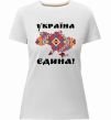 Женская приталенная премиум-футболка собственного производства. Выполнена из качественной ткани (95% хлопок, 5% эластан) — плотная, мягкая и приятная к телу. Принт УКРАЇНА ЄДИНА - вишиванка! можно нанести на грудь, спину или рукав.