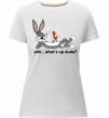 Женская приталенная премиум-футболка собственного производства. Выполнена из качественной ткани (95% хлопок, 5% эластан) — плотная, мягкая и приятная к телу. Принт Whats up dude? Bugs можно нанести на грудь, спину или рукав.